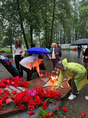 Сегодня утром заместитель Главы Чудовского муниципального района Олеся Юрьевна Мещерякова и молодежь района зажгли свечи и возложили цветы на территории мемориала Вечный огонь.